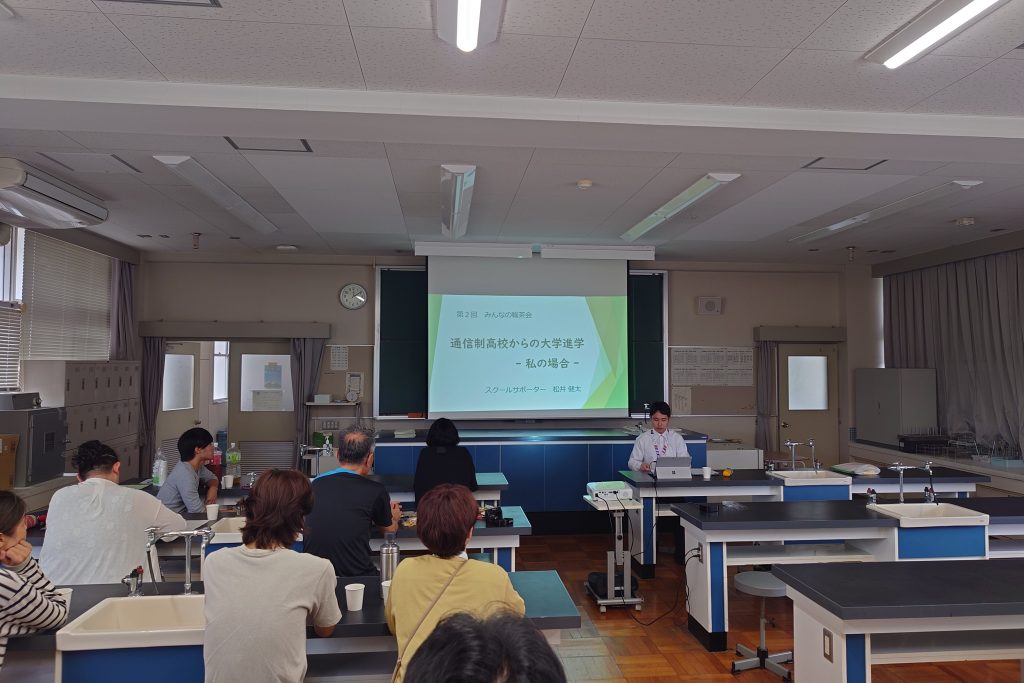 後半は、本日より、スクールサポーターとして着任した松井健太さん(京都産業大学文化学部2回生)が、ゲストスピーカーとして『通信制高校からの大学進学』という題で、20分間のプレゼンテーションをおこないました。松井さん自身も通信制高校からの四大進学で、「進学して、なりたい自分になる」と自分自身が納得して勉学に励んだこと、メタ認知力の意義ある活用について、プレゼンをしてくれました。将来は教職に就けるよう、このスクールサポートの体験も大切にしたいとのことでした。