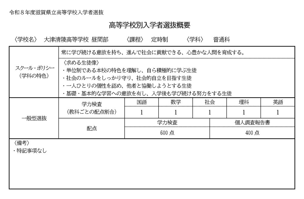 【随時更新】令和8年度(2026年度)入学者選抜 2025年11月21日 最終更新日時 : 2025年11月21日 投稿者昼間部令和8年度(2026年度)入学者選抜最新の情報は必ず滋賀県教育委員会のホームページでご確認ください。滋賀県入試情報大津清陵高等学校(昼間部)を受検される方へ 受検上の注意(準備中) 入学許可予定者オリエンテーションについて(準備中)3月23日(月)13:30より開催予定です。大津清陵高等学校(昼間部)の選抜概要